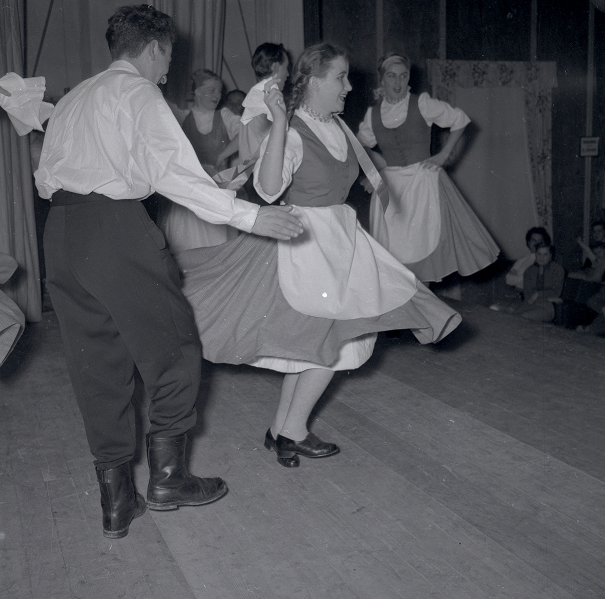 Bild tagen i samband med att flyktingar ifrån Ungern kom 1956. Män och kvinnor som dansar. Kvinnorna dansar i traditionella folkträkter i Godtemplargården hösten 56 - våren 57.