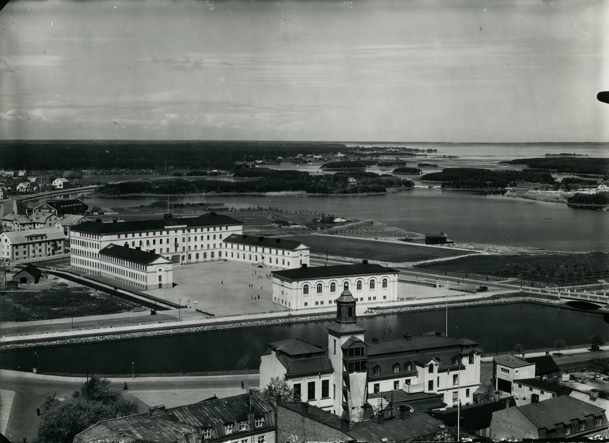 Vy norrut från gamla vattentornet, med brandstationen till höger i förgrunden och Läroverket (Stagneliusskolan) i mitten.