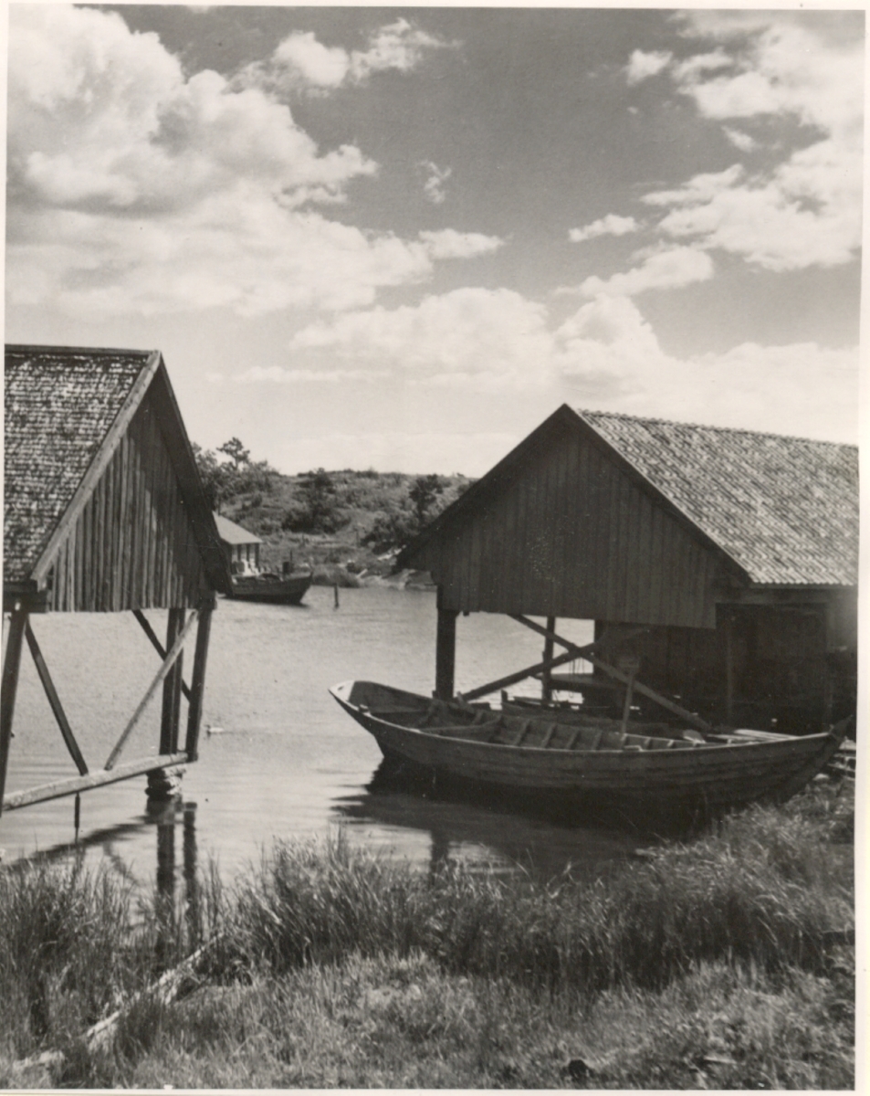 1896 års storöka förtöjd mellan två bodar i Strupö hamn. Observera lyftningen i aktern.
