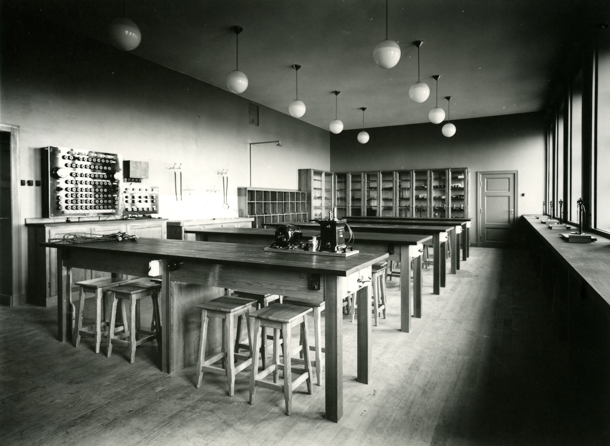 Interiör av en skolsal, antagligen för utbildning inom elektronik.