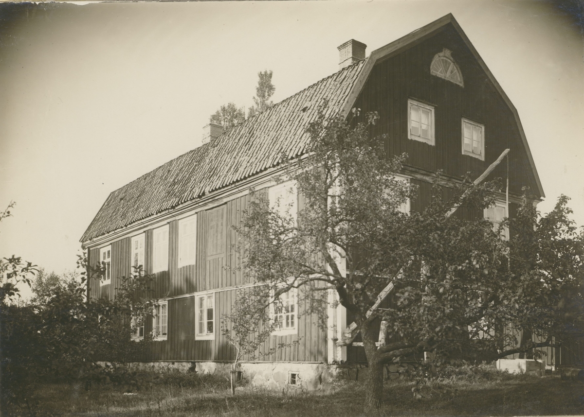 Huvudbyggnaden från trädgårdssidan. Vid gaveln brunn med stång.