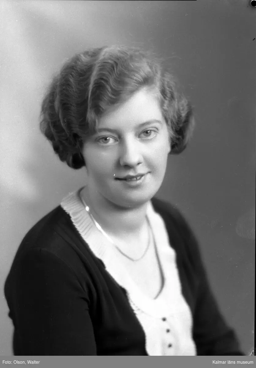 Ateljébild på en kvinna i halsband och jumper. Enligt Walter Olsons journal är bilden beställd av Vera Andersson.