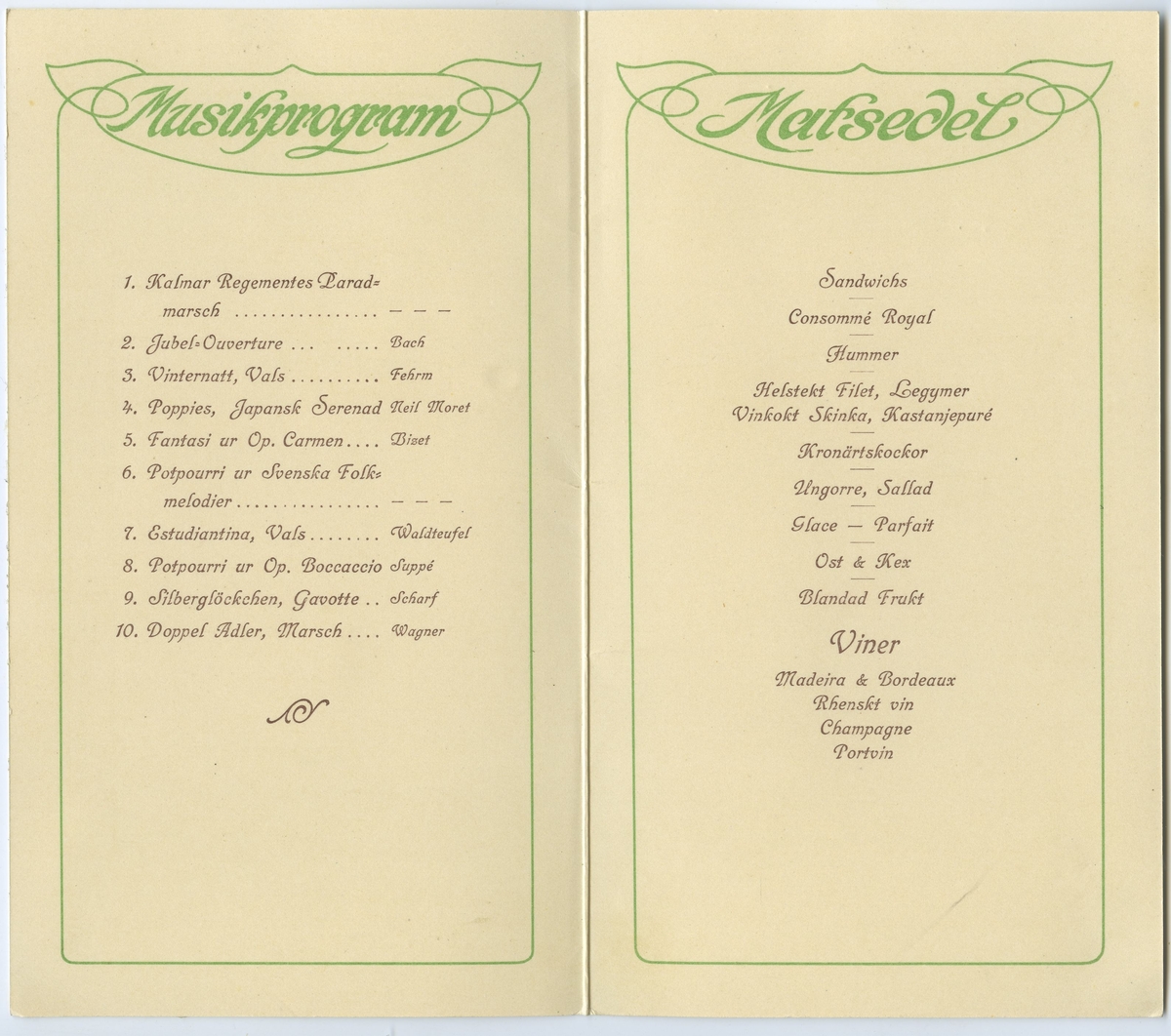 Matsedel och musikprogram för St Johanneslogen Carls 50 års jubileum.