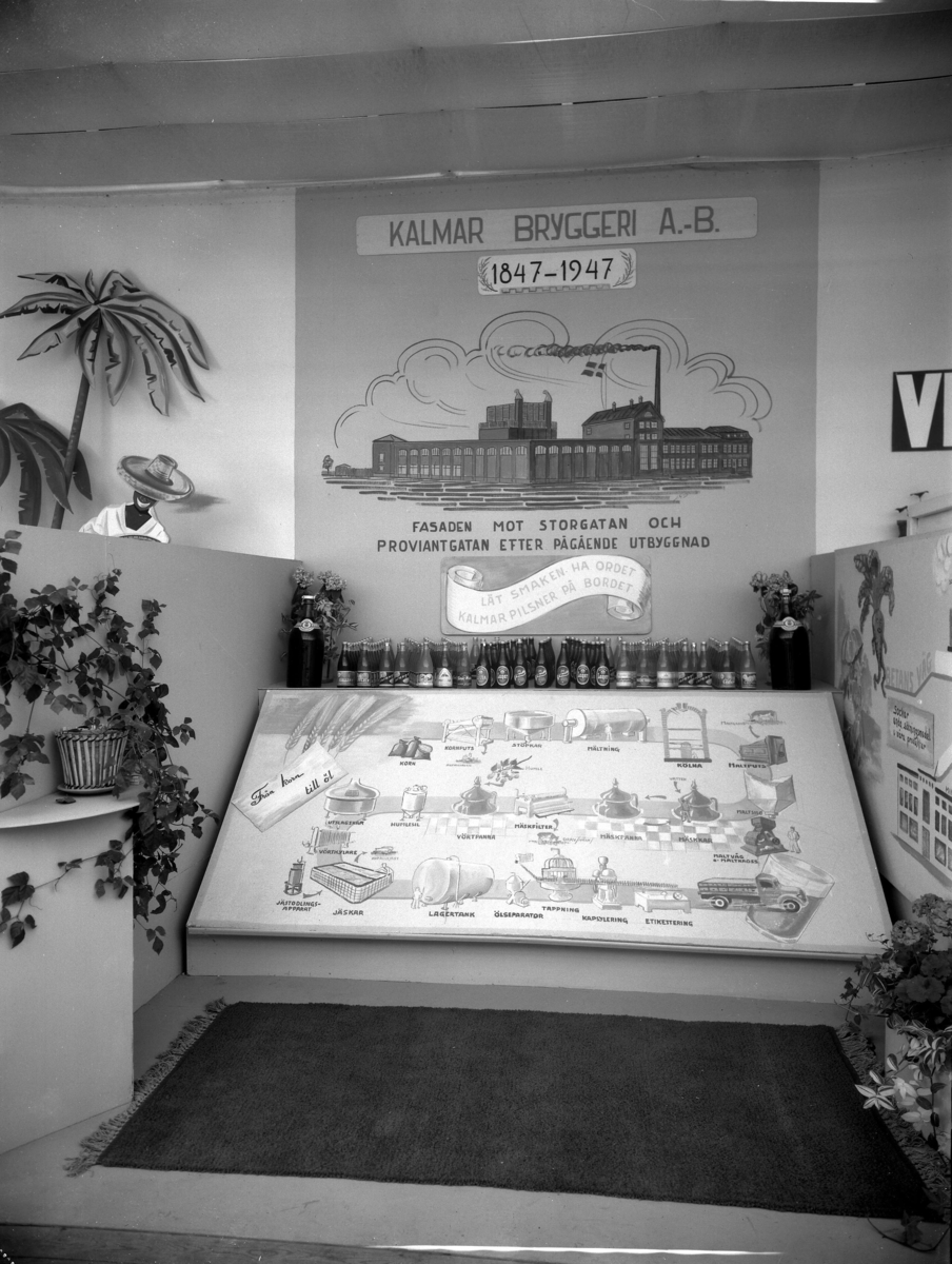 Text på den stora skärmen: "Kalmar Bryggeri A-B 1847-1947 Fasaden mot Storgatan och Proviantgatan efter pågående utbyggnad "Låt smaken ha ordet Kalmar Pilsner på bordet"