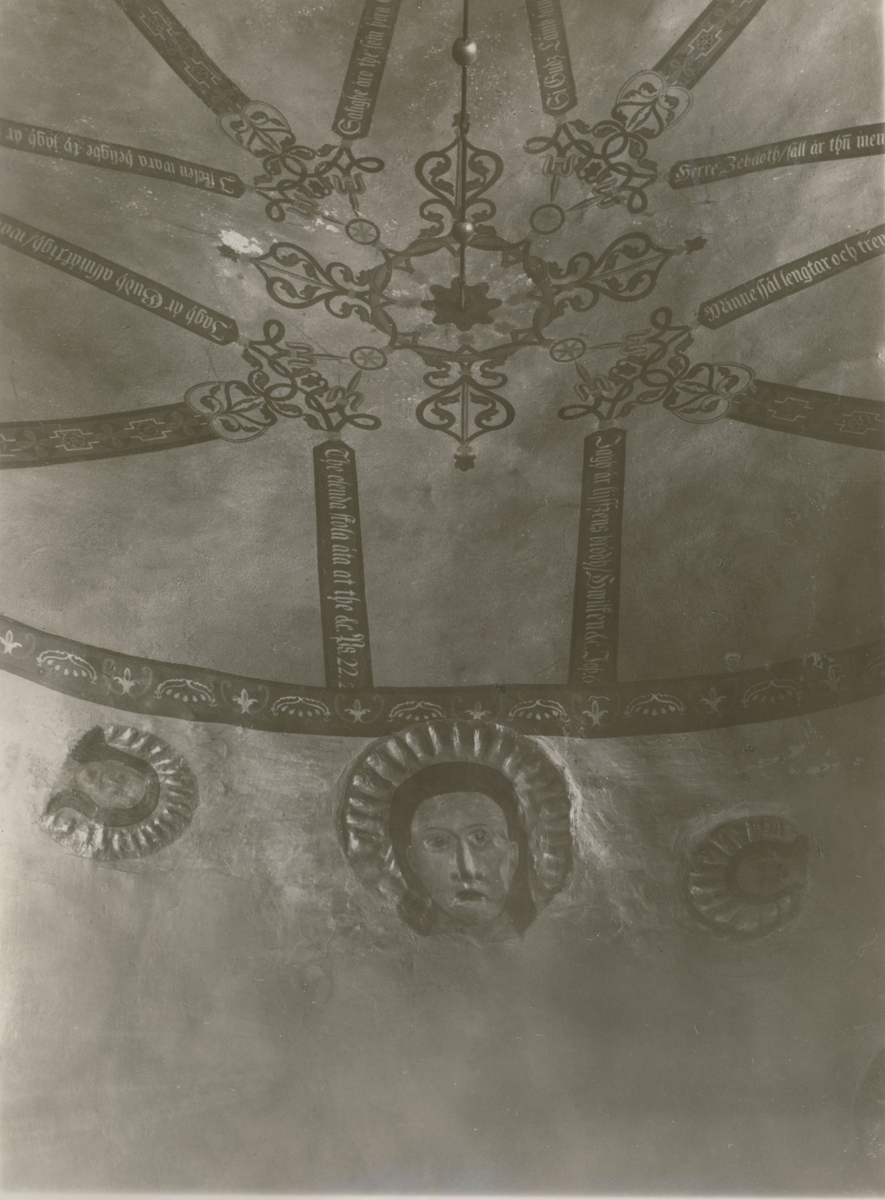 Korabsidens valv i Hossmo kyrka med fragment av relief-dekoration från romansk tid.