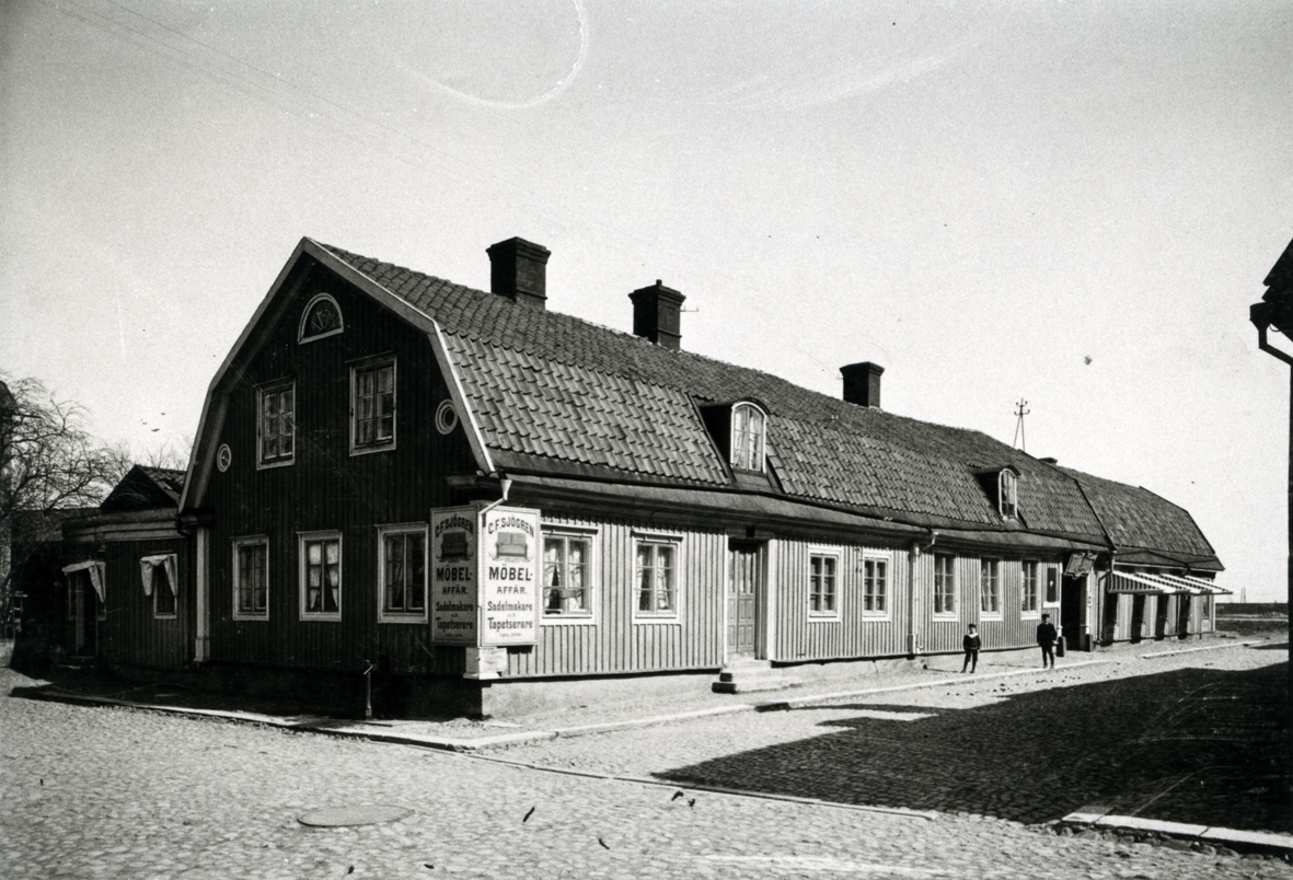 Sahlströmska huset i kvarter muren. En butiksbyggnad. Bild tagen 1908.