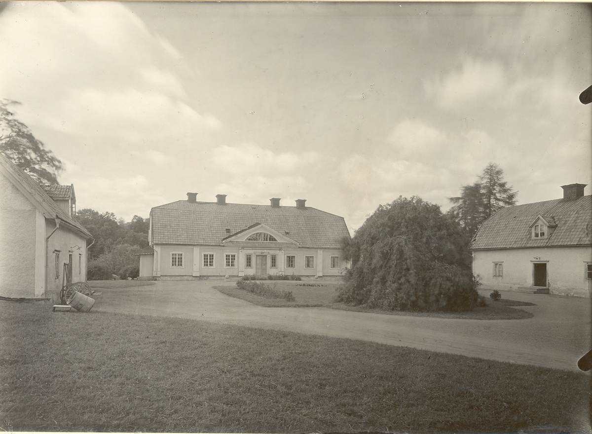 Mangården. Huvudbyggnad i trä med stående panel. Färg grågrön. Flyglarna är spritputsade trähus.