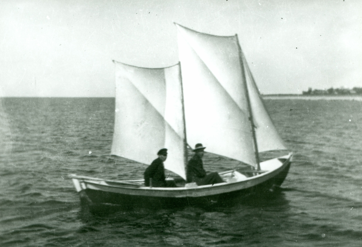 Två män i en allmogebåt med sprisegel.