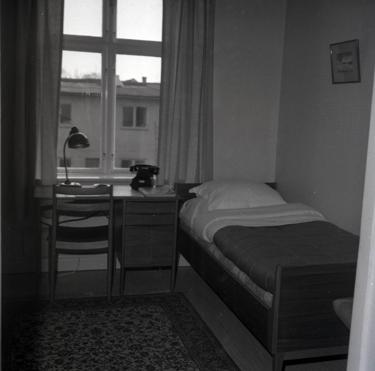 Stadshotellet inredning. Ett enkelrum. Ett fönster med gardiner, en arbetsbänk och en säng.