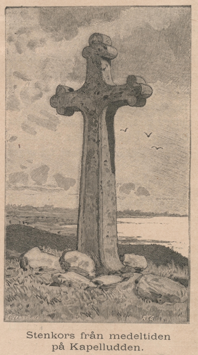 Stenkorset på Kapelludden, efter teckning av Albert Theodor Gellerstedt. Korset bröts i delar när en sjöbod, som slet sig under stormen Per i januari 2007, landade på korset. Det har senare restaurerats i Riksantikvarieämbetets regi.