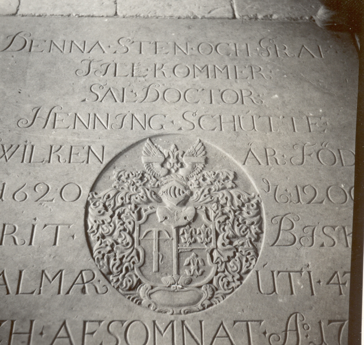 Biskop Henning Schüttes gravhäll mitt för altarringen. Kläckeberga kyrka. Henning Schütte var förste biskop i Kalmar stift. Han avled 1708.
