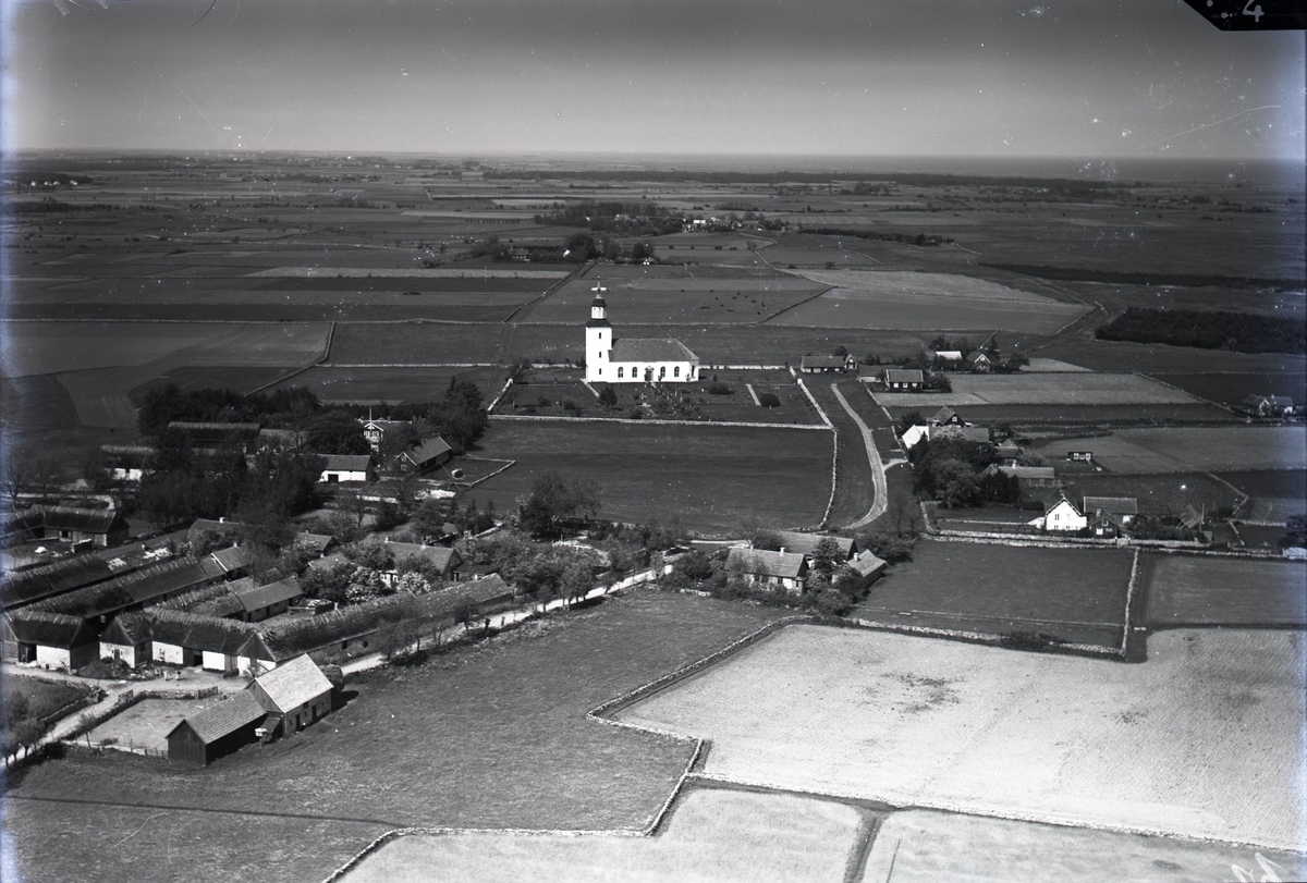 Flygfoto över Sandby kyrka och kyrkogård.