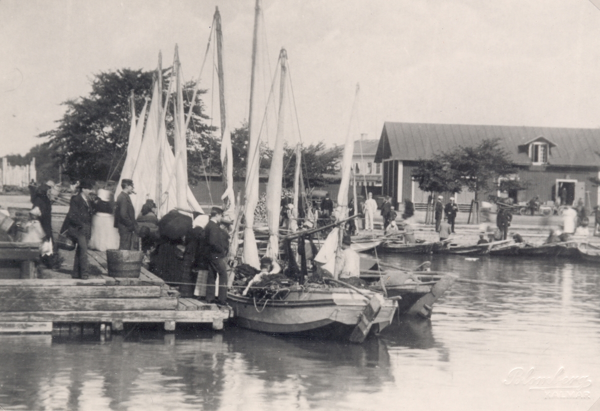 Motiv från hamnen i Kalmar. Troligen säljs fisk från de små båtarna.