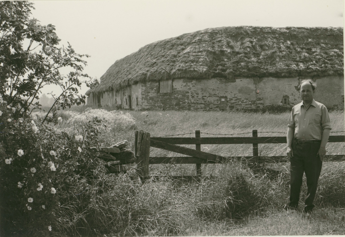 Filosofie doktor Bertil Palm vid en ladugård med torvtak.