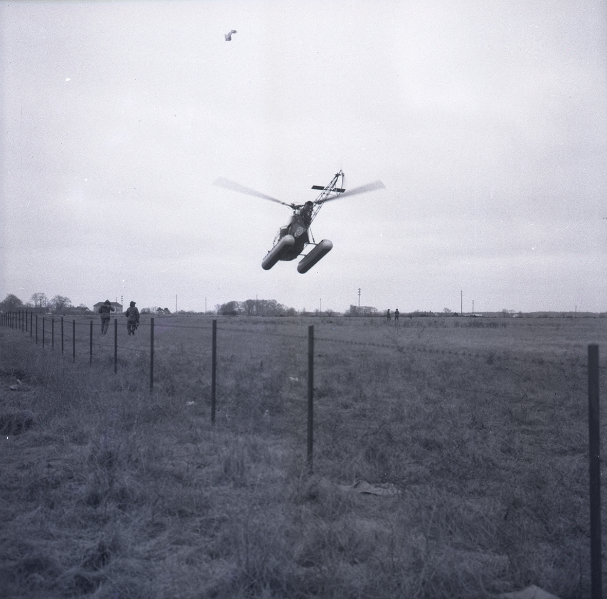 Bild från militärövningen Ölandskriget. En helikoper från marinen flyger iväg.