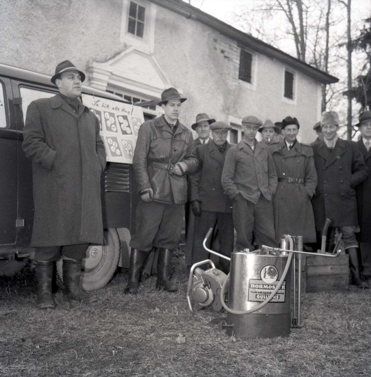 Skogsvårdskurs i Gärdslösa. Framför männen står en tryckspruta med växtbekämpningsmedlet hormoslyr från Gullviks i Malmö.