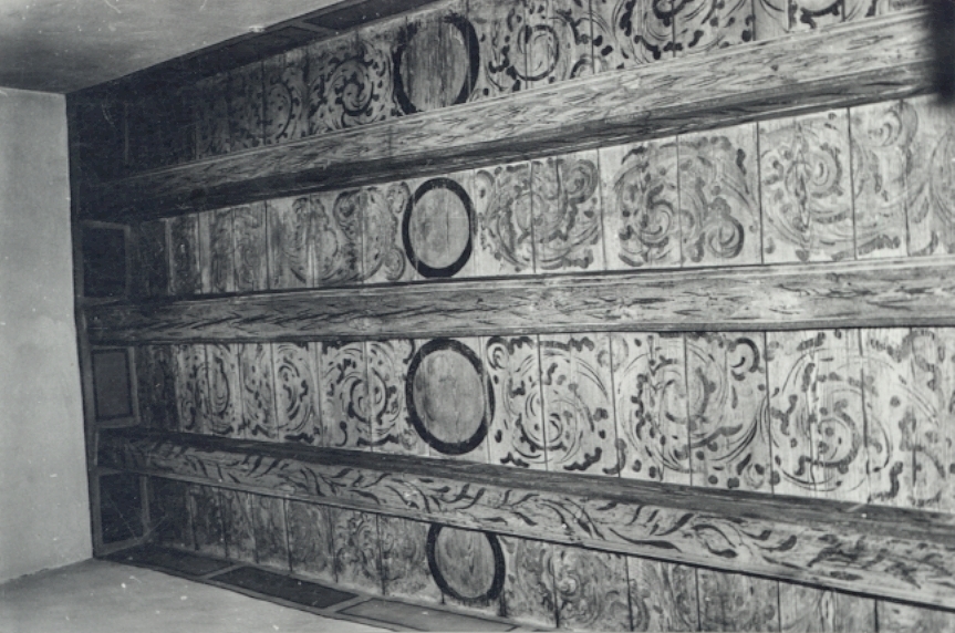 Målat bjälklag i bottenvåningen i Dahmska huset.