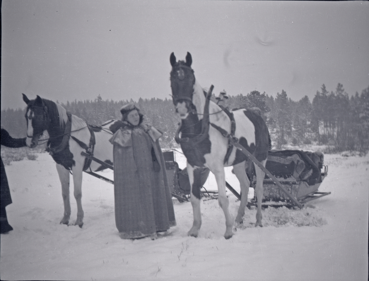 En kvinna med två hästar som är spända för slädar. I närheten av Tuna gård.