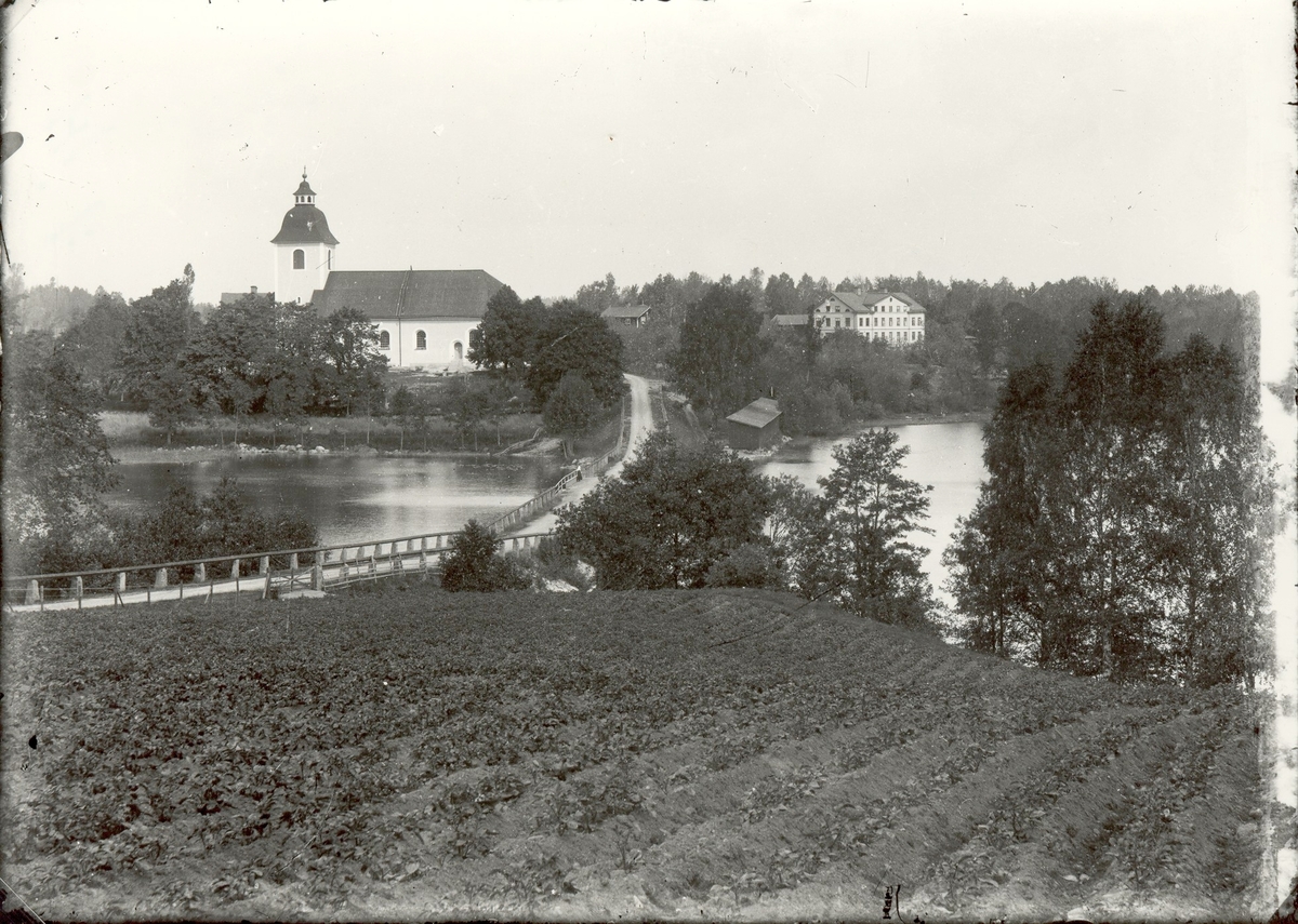 Vy över Hjorted med kyrkan och sjön Hjorten.