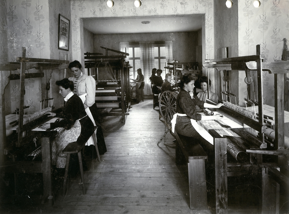 Vävsal hos Kalmar läns hemslöjdsförening. När lantbrukets folk flyttade in till staden hade de i de flesta fall inte plats för de hantverk de tidigare utövat. Att då gå samman och skaffa en lokal löste ofta problemet. Här ser vi unga kvinnor som väver 1924. Genom att väva fick de oftast bättre textilier an de som stod att köpa och dessutom tilll en billigare penning.