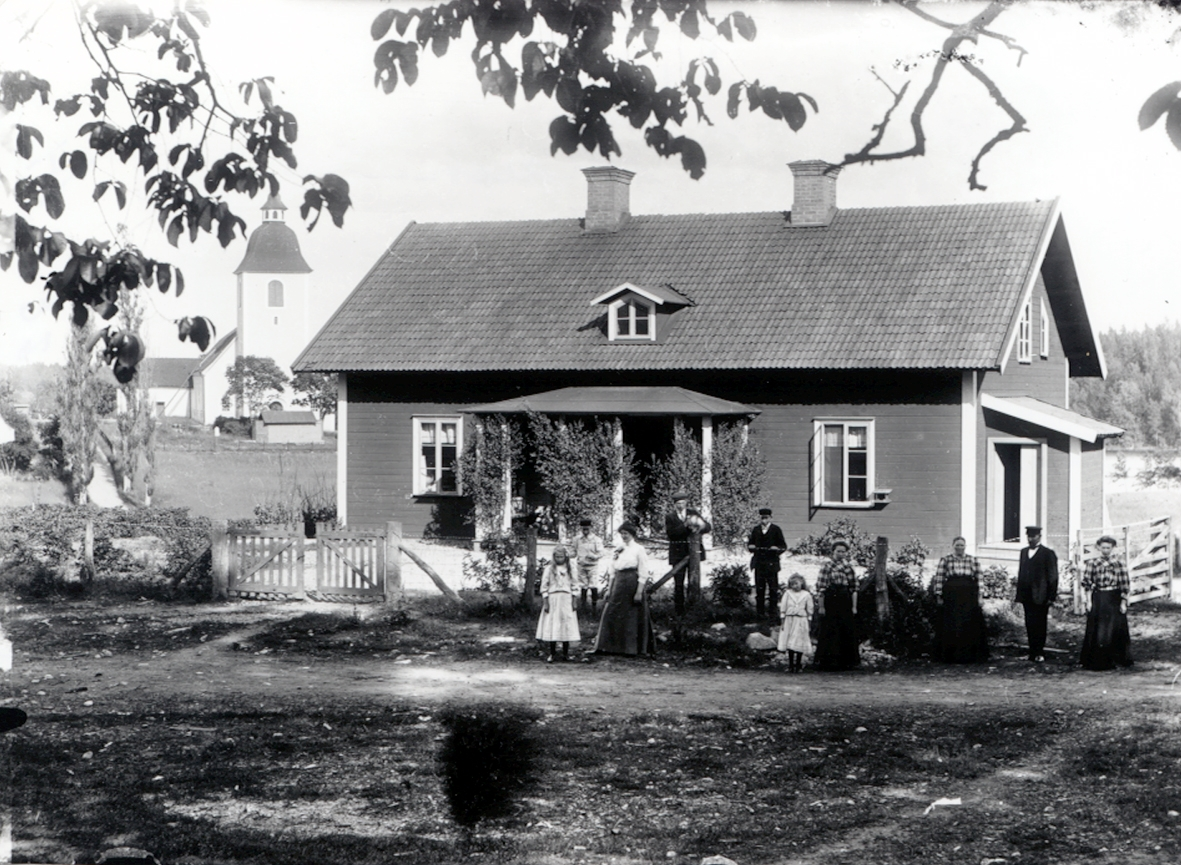 Grupporträtt av C Johanssons familj utanför prästgården i Hjorted 1911.