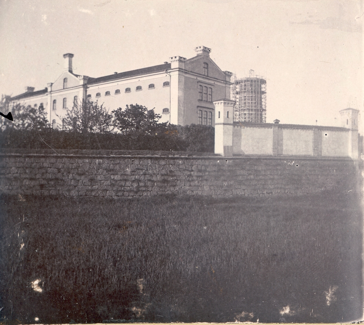 Ett av Sveriges äldsta cellfängelser, färdigt 1852. I bakgrunden byggs gamla vattentornet.