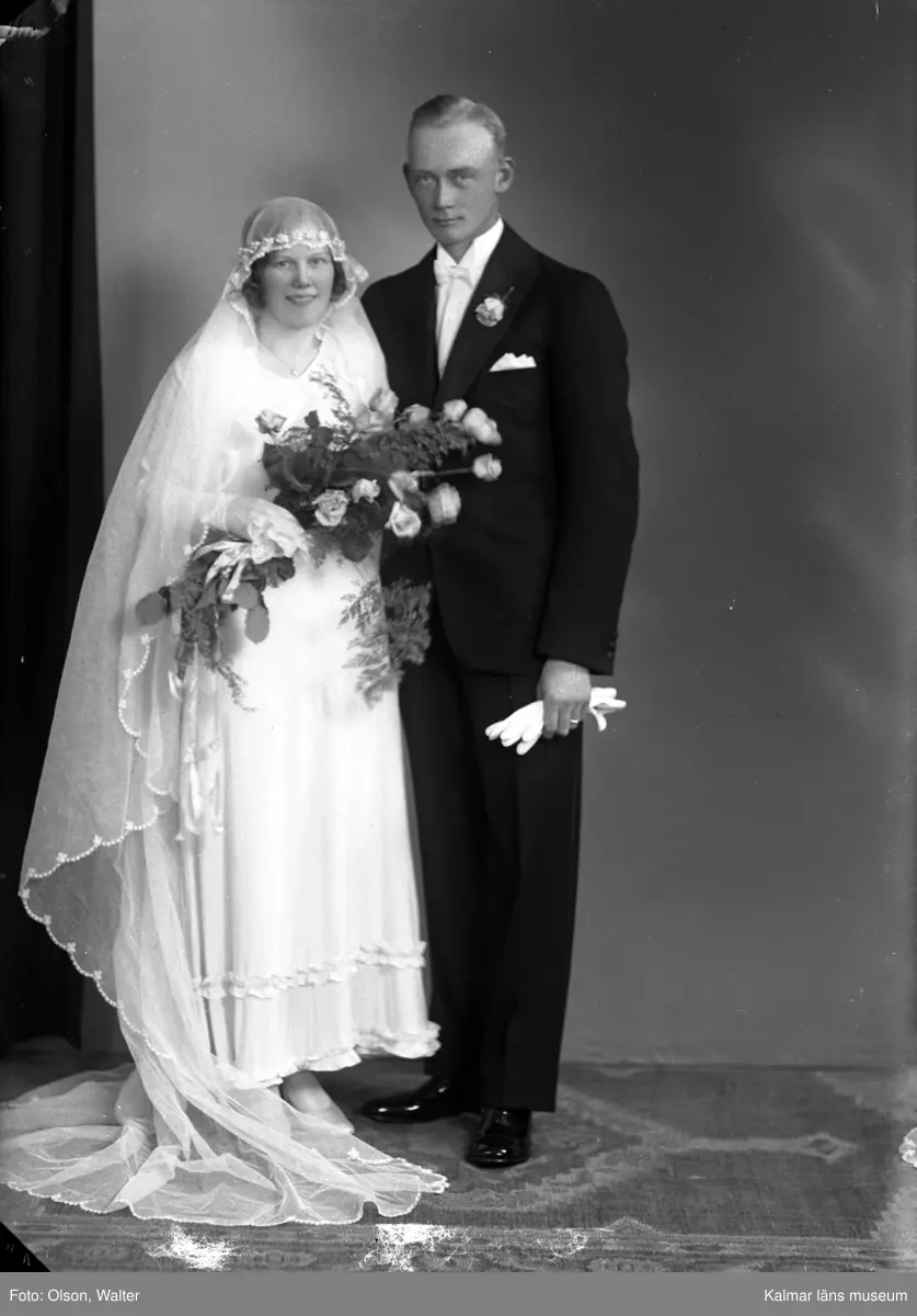 Bröllopsbild på en kvinna i brudklänning hållande en blombukett. Mannen har kostym. Enligt Walter Olsons journal är bilden beställd av herr Erik Johansson ifrån Tullstationen, Sikån.