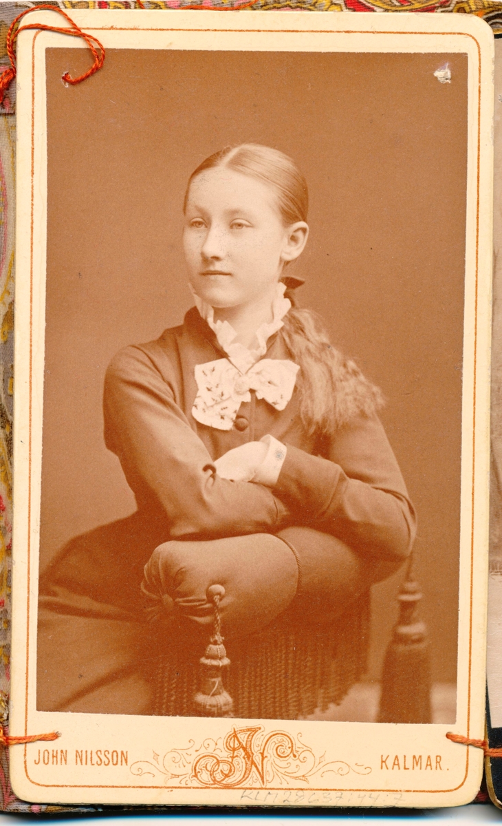 Porträtt på en flicka, fotot är monterat (fastsytt) i ett tygomslag. Därför kan baksidan ej skannas.