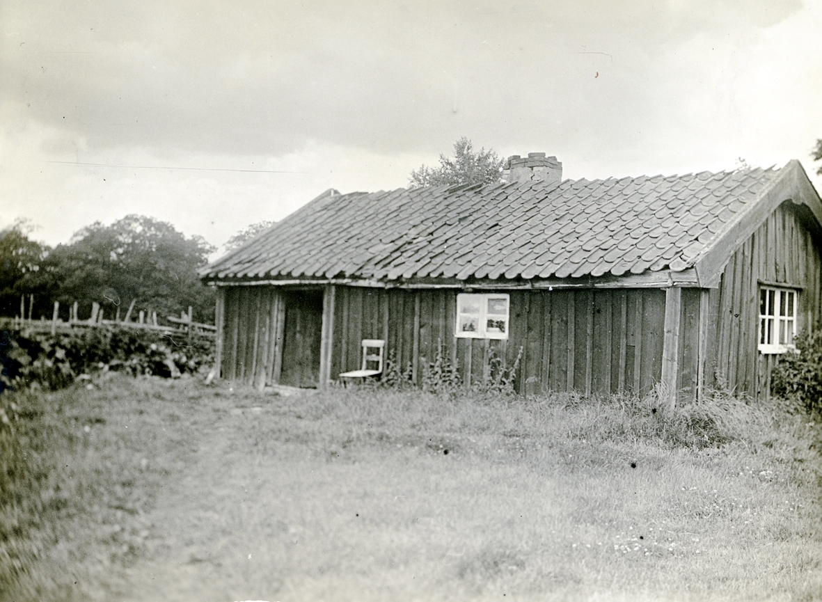 "Sylvanders stuga" vid Björkenäs. Här bodde fornfoskaren Volmar Sylvander under sina undersökningar på Björkenäs på 1840-talet. Stuga av korsknutat timmer.