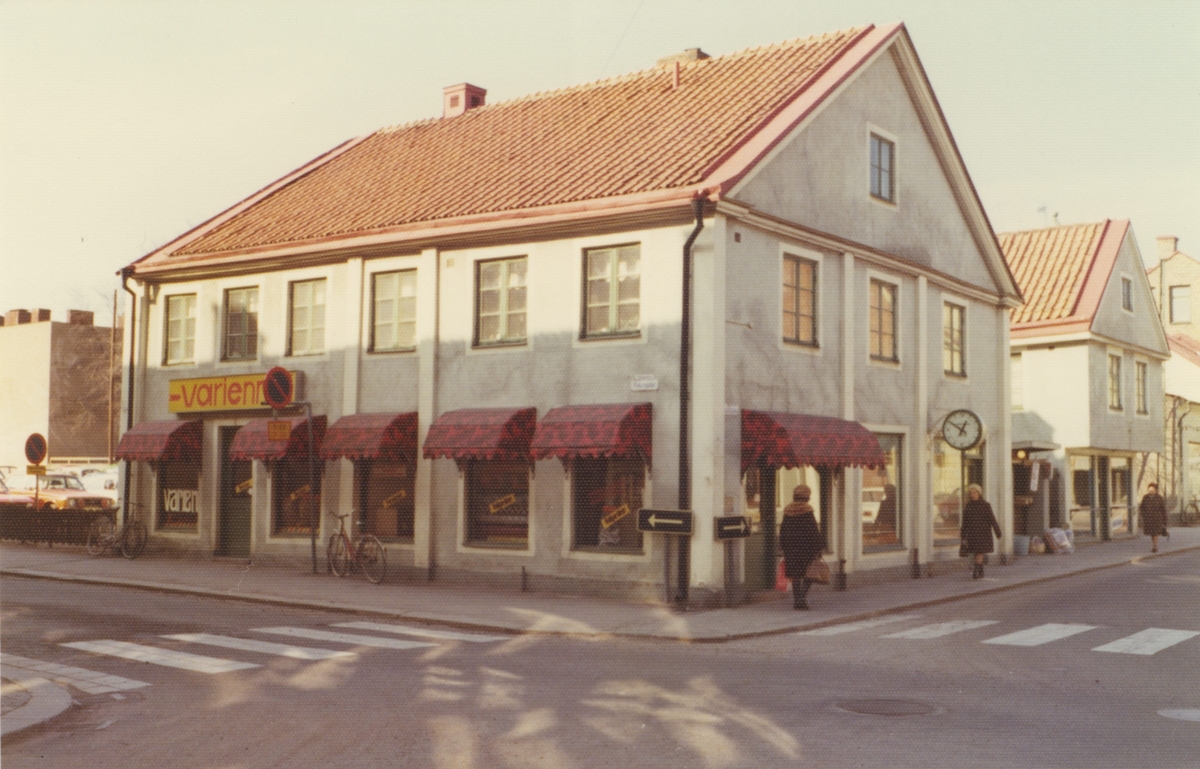 Butiksbyggnad med putsad fasad mot Fiskaregatan. Bilderna är tagna inom ramen för Kalmar kommuns inventering av Kvarnholmens bebyggelse 1970-1971 och skänkta till länsmuseet.