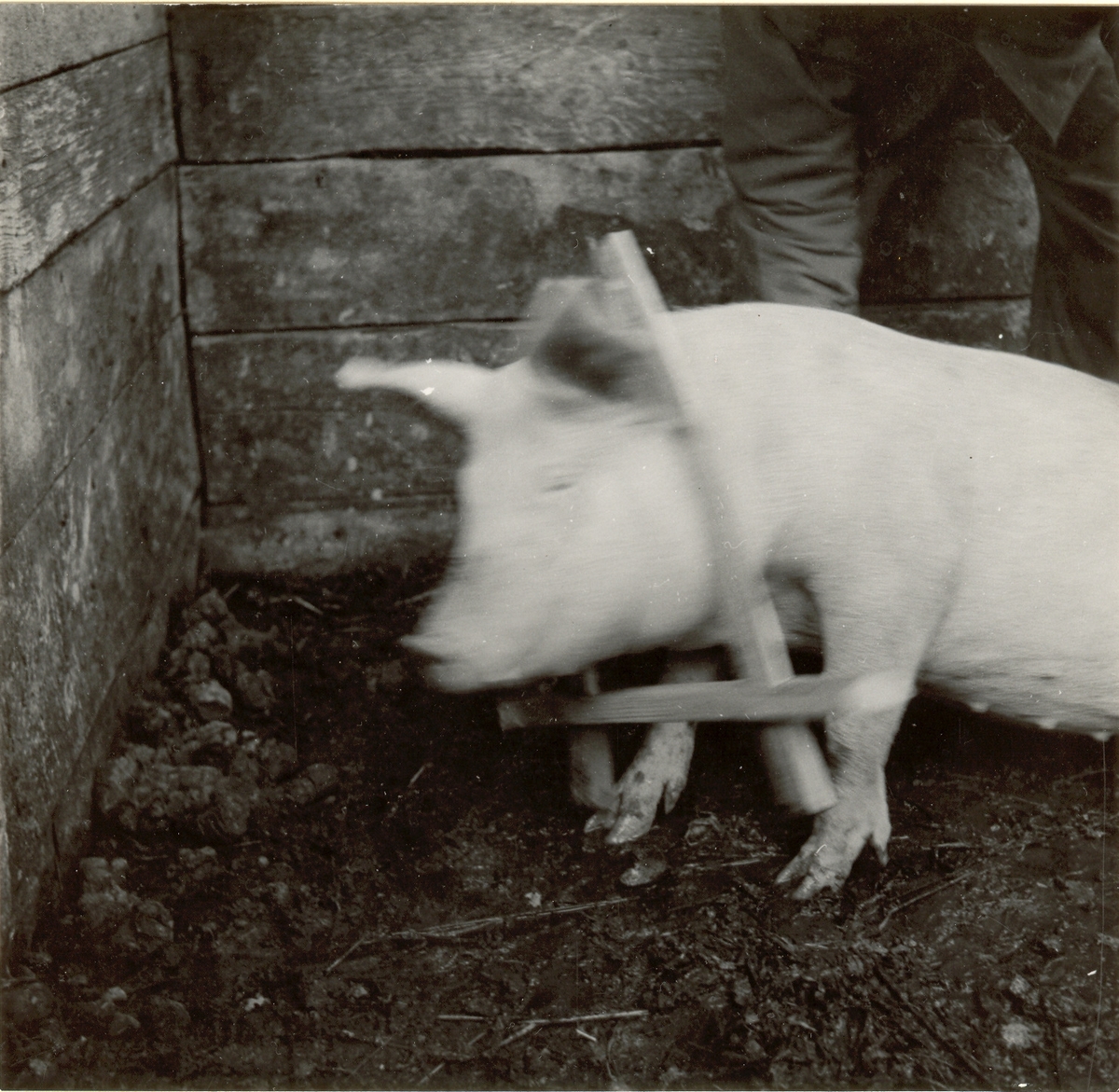 Karl Erlandssons gris med grisok, Valåkra by. Utegående grisar kunde förses med dylika anordningar för att förhindra att de sprang bort.