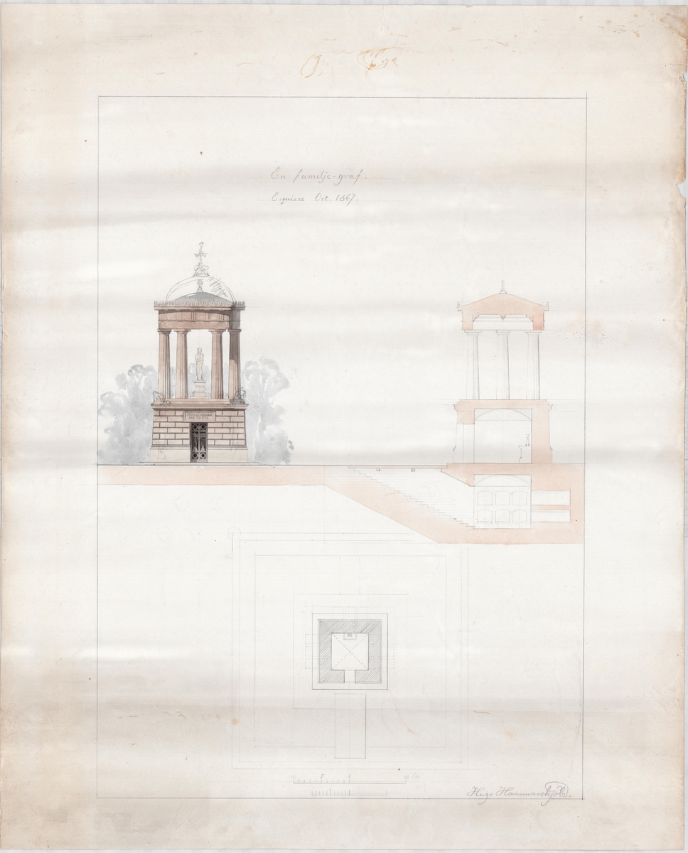 Kolorerad arkitektritning av Hugo Hammarskjöld. Akademiprojekt: Skiss till familjegrav familjegrav. Årtal oktober 1867.