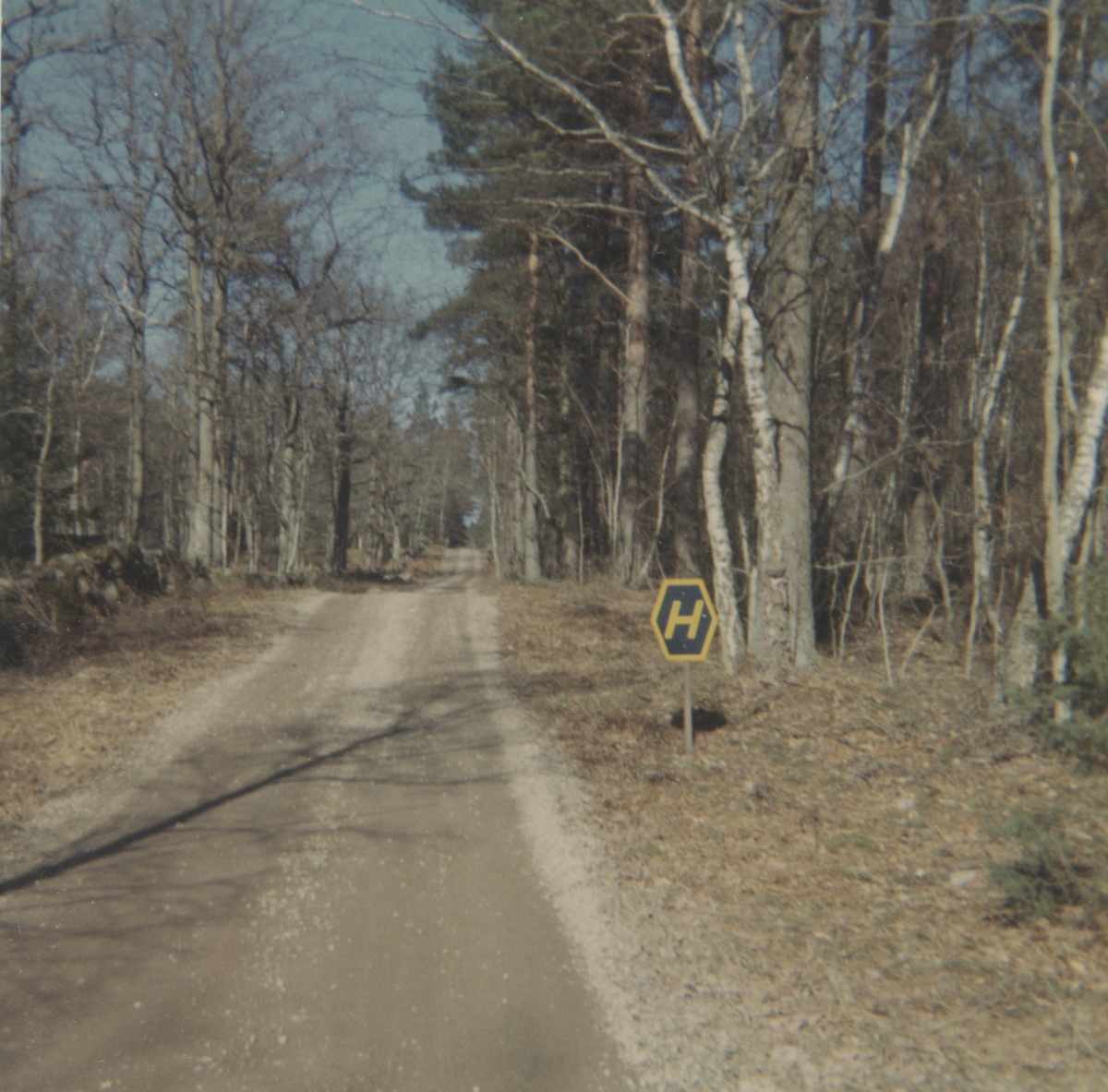 Numera alltid lika aktuellt på alla våra vägar, Lökenäsvägen. Glömminge10 april. Detta H-märke syntes överallt som en påminnelse om att man skulle hålla till höger efter trafikomläggningen 3 september 1967.