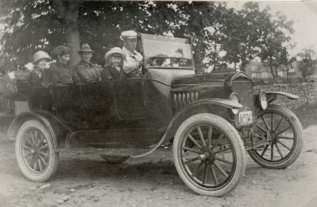 Vid ratten till T-Ford Touring, 1920 ca, Valdemar Västerlund, bredvid honom brorsonen Sven Västerlund. I baksätet från höger; Valdemars bror Gustaf Västerlund, hans hustru Ester och en bekant till familjen.