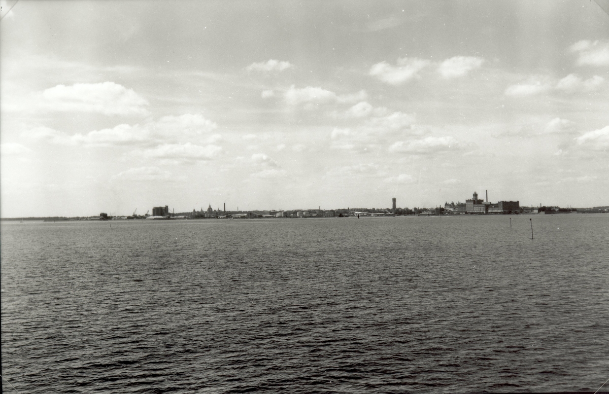 Kalmar. Från syd-sydost med Kalmar ångkvarn, spannmålssilon och gamla vattentornet som dominanta inslag. Även Kalmar slott i bakgrunden.