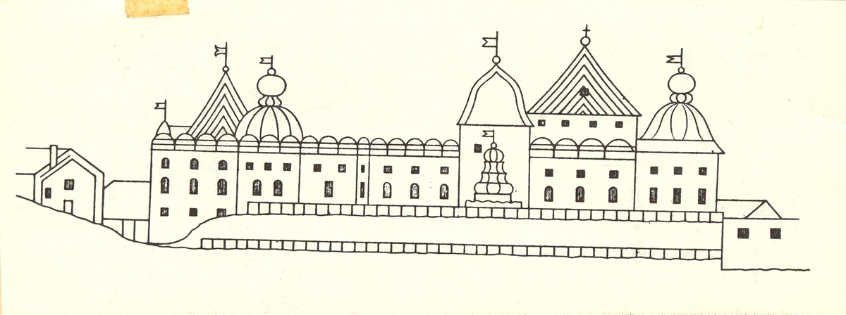 Kalmar slott sett från norr omkring 1560. Efter en bild i intarsia som enligt W. Sylvander skall ha funnits i kungsmakets panel (fält 8) före restaureringen på 1850-talet.