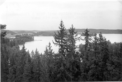 Utsikt över Fullbosjön i Ukna socken. I förgrunden en ridå med granar, bakom vilken Fullbosjön framträder i bildens mellanplan. I bakgrunden syns tydligt det kuperade landskapet i trakten.