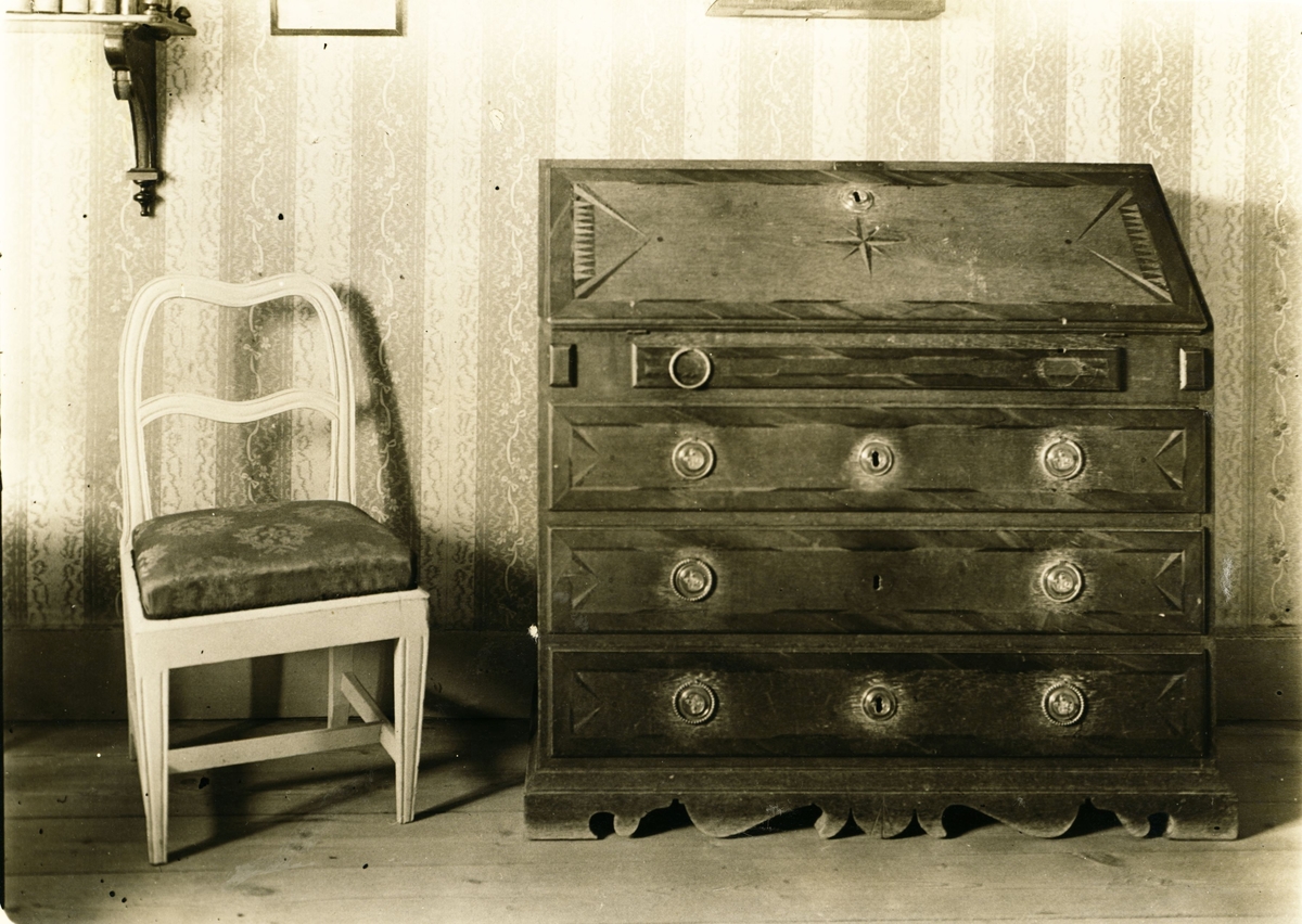 Byrå i rokoko, med enkel rutinläggning i alm eller dylikt träslag. Handtag o. skyltar av förgylld brons. Tillhört ägarens mormor, Klövdala. Stolar av björk, senempire.