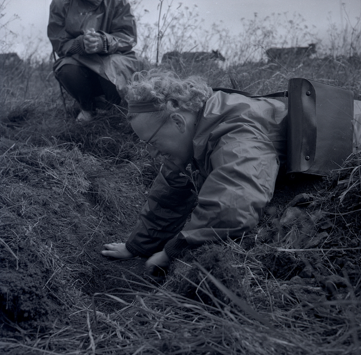 Dr. Ragnhild Boström och Ulf Erik Hagberg gör en arkeologisk undesökning i Kåreholm, juli 1962.