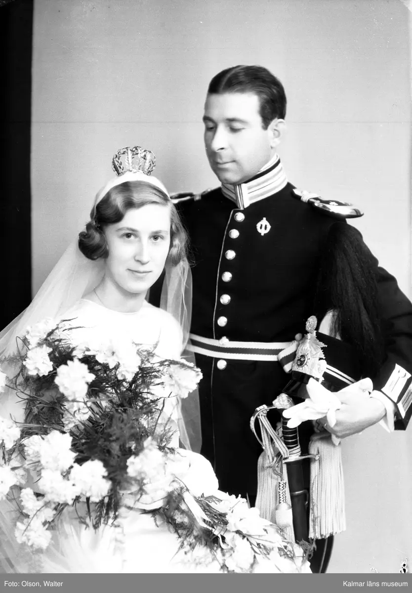 Bröllopsbild. Kvinnan har brudkrona och håller i en blombukett. Mannen har en paraduniform och värja. Mannen har en paraduniform med en värja. Enligt Walter Olsons journal är bilden beställd av löjtnant Stig Erholts.