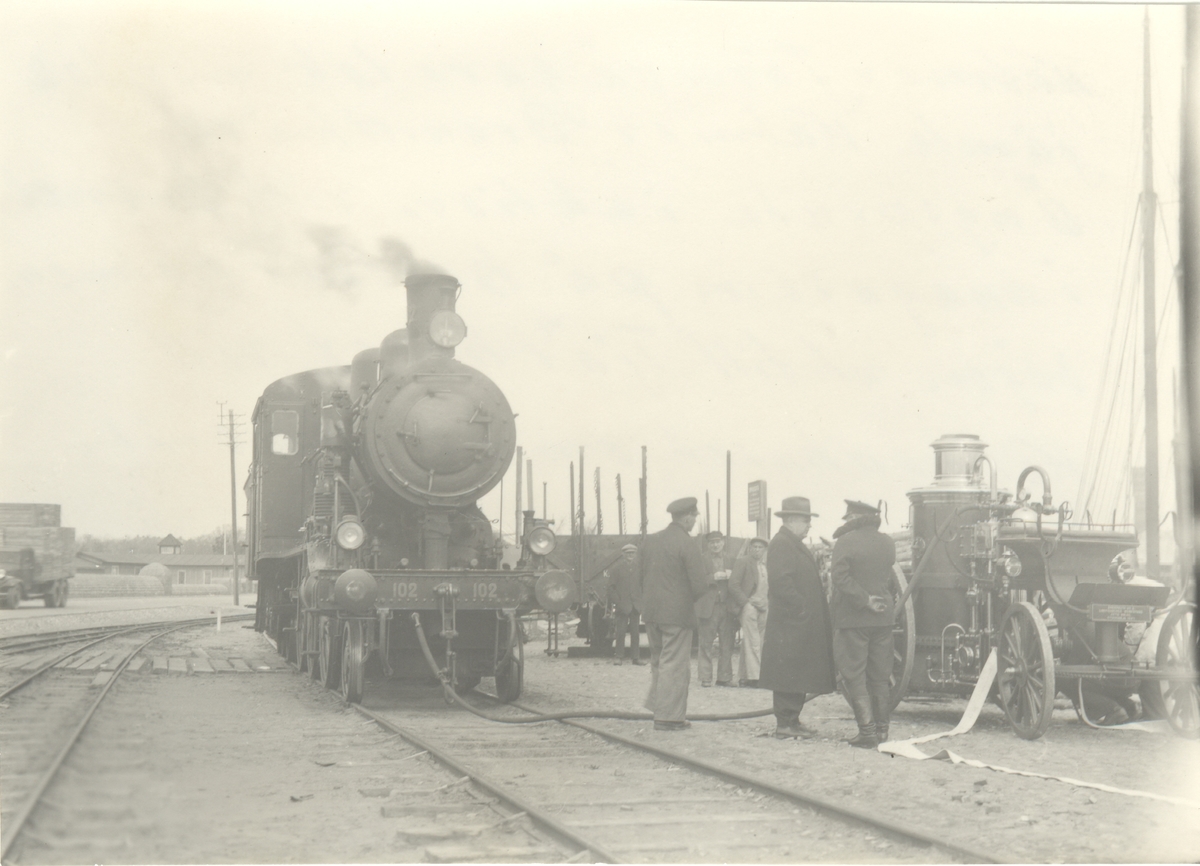 Kalmar Järnvägars lok nummer 102 jämte Kalmar Brandkårs ångspruta i aktion vid brand i magasin på kajen i den så kallade Bågen på vägen ut till Tjärhovet. Till vänster skymtar kallbadhuset omkring 1920-21.
