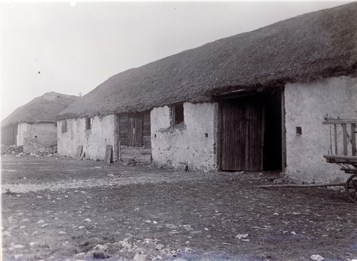 Gårdar byggda av kalksten och trä i byn Hjälmestad på Öland. Fotografiet är taget från landsvägen.