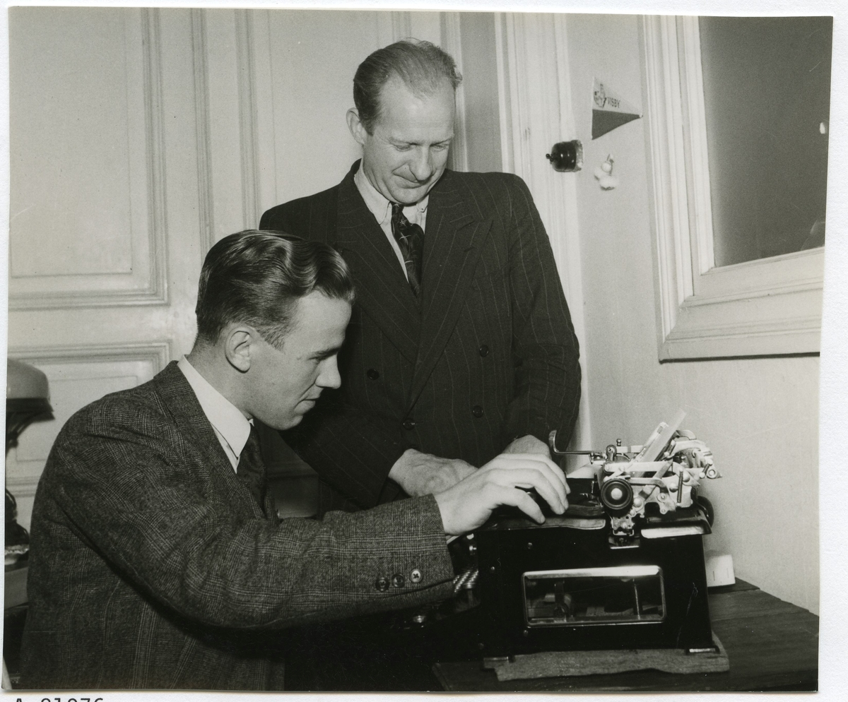 Skotte Linde och ytterligare en man vid en skrivmaskin.