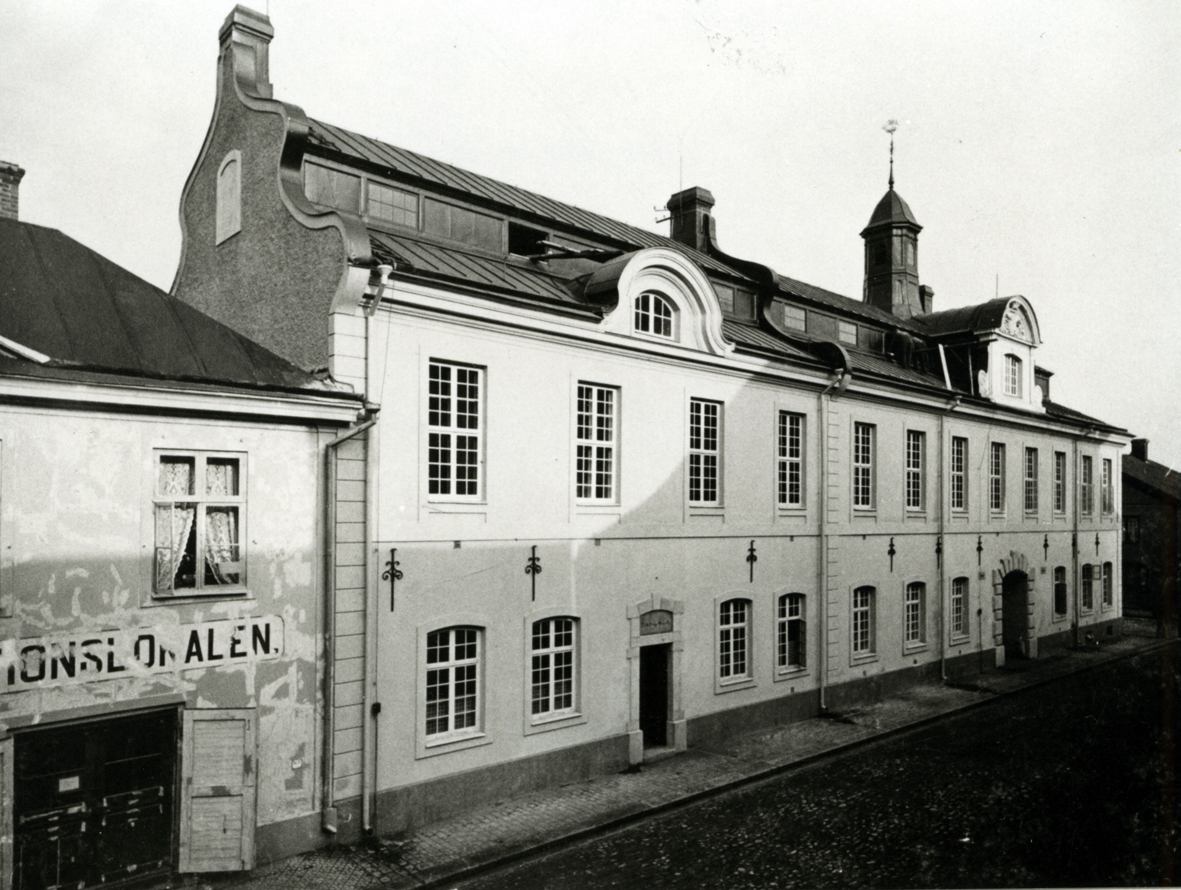 Polishuset i Kalmar med ankarslut och takkupor samt trappgavel. År 1908.