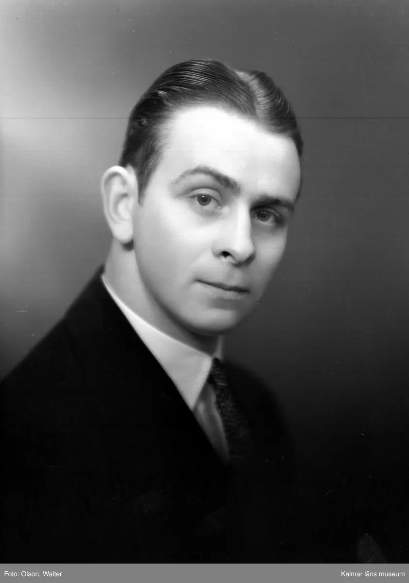 Ateljébild på en man. Enligt Walter Olsons journal är bilden beställd av herr B Lindquist ifrån Skandinaviska Kredit AB.