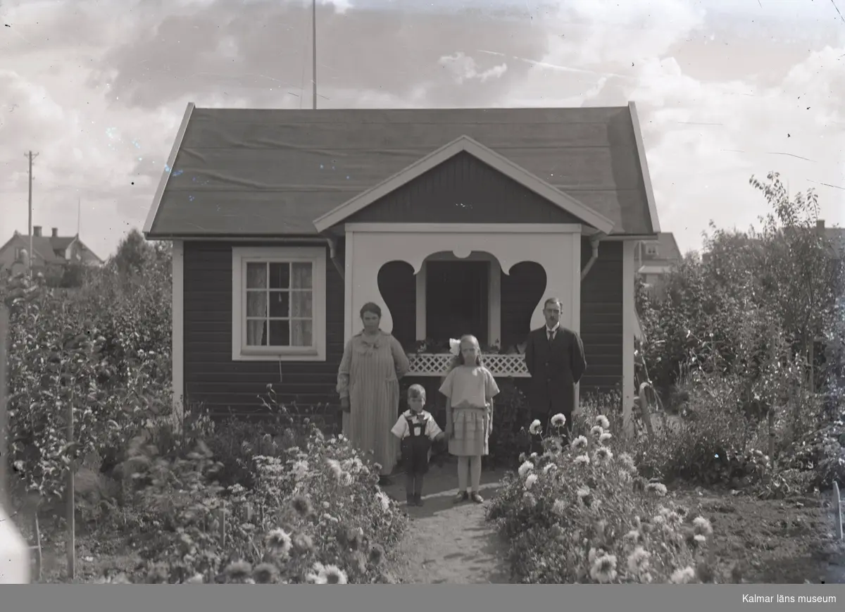 En stuga, man kvinna och två barn i Kalmar södra koloniområde, fotograferat omkring 1930. Kalmar södra koloniförening grundades 1917 och har idag 105 kolonilotter. Området ligger strax söder om länssjukhuset i Kalmar med huvudingång från Stensbergsvägen.