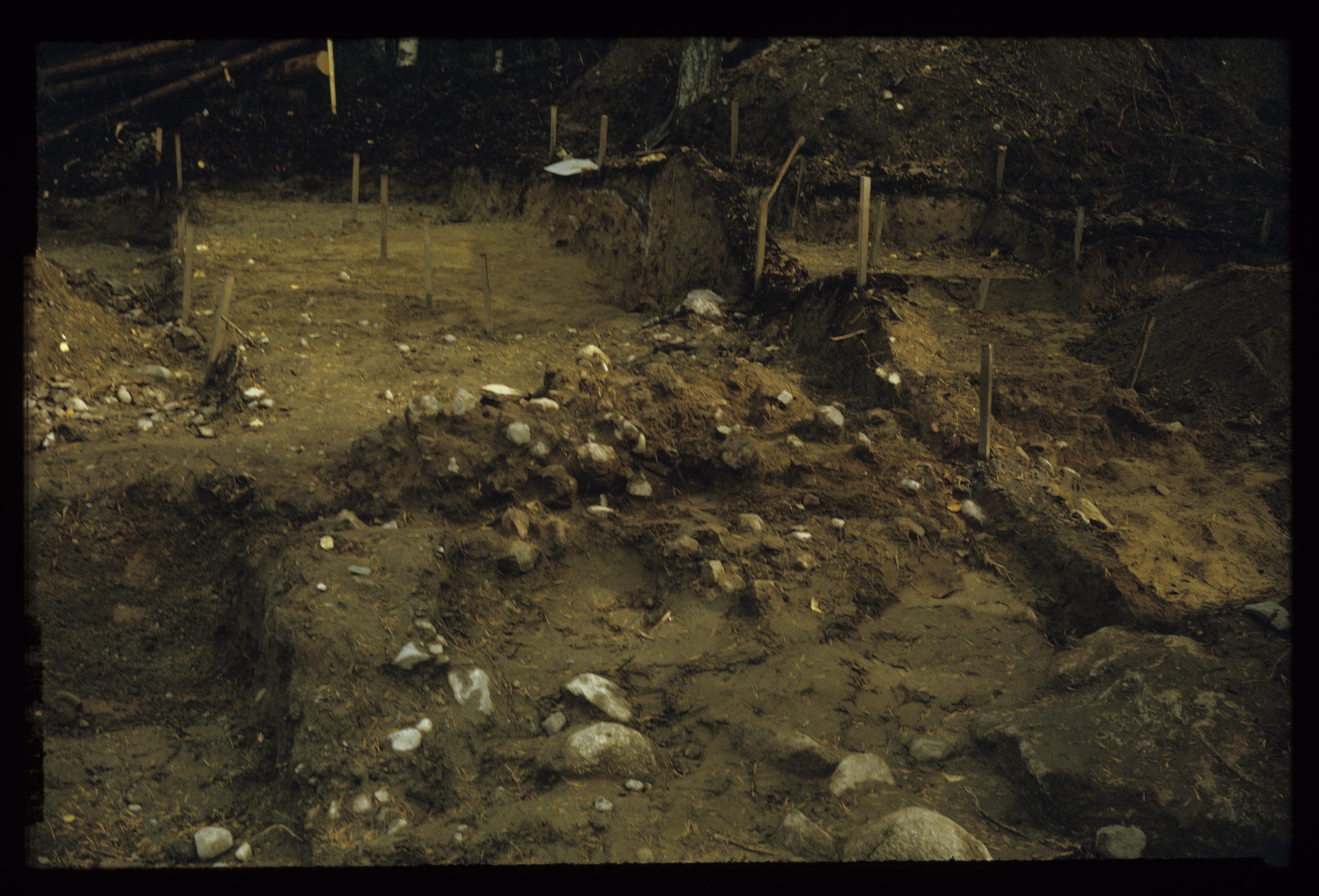 Lemnäset vid Lesjön. Boplats S 104. S vallen. Det kompakta skärvstenslagret och profil J-K. Mot ÖSÖ.