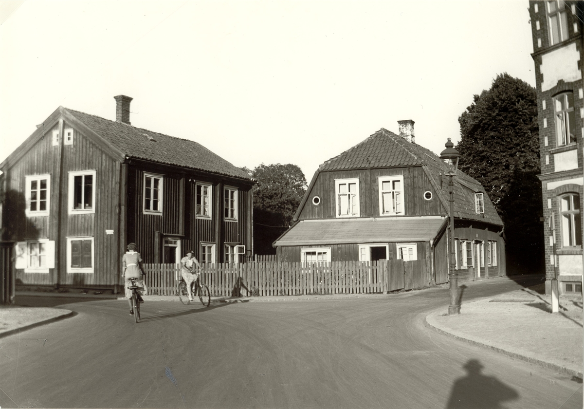 Korsningen Lindölundsgatan - Trädgårdsgatan. Huset med brutet tak är "Barnhemmet". Huset till vänster är Lindölundsgatan 6, och längst till höger i bild Lindölundsgatan 4.