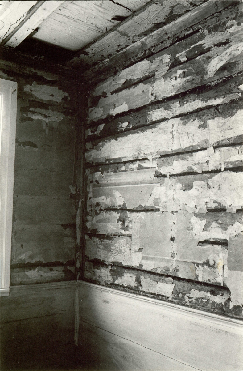 Östra väggen i kammaren i Krusenstiernska gården, närmast fönsterväggen. Rester av målad tapet.