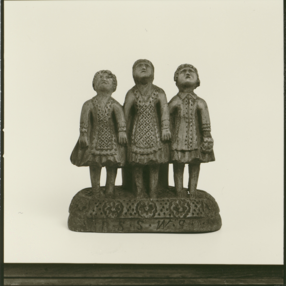 Alster av bildhuggaren Johan August Gustafsson i Seby. Bröllopstavla med skurna figurer och altartavla i form av en fastklistrad kristusbild, urklippt ur någon illustrerad veckotidning. Höjd 65 cm.